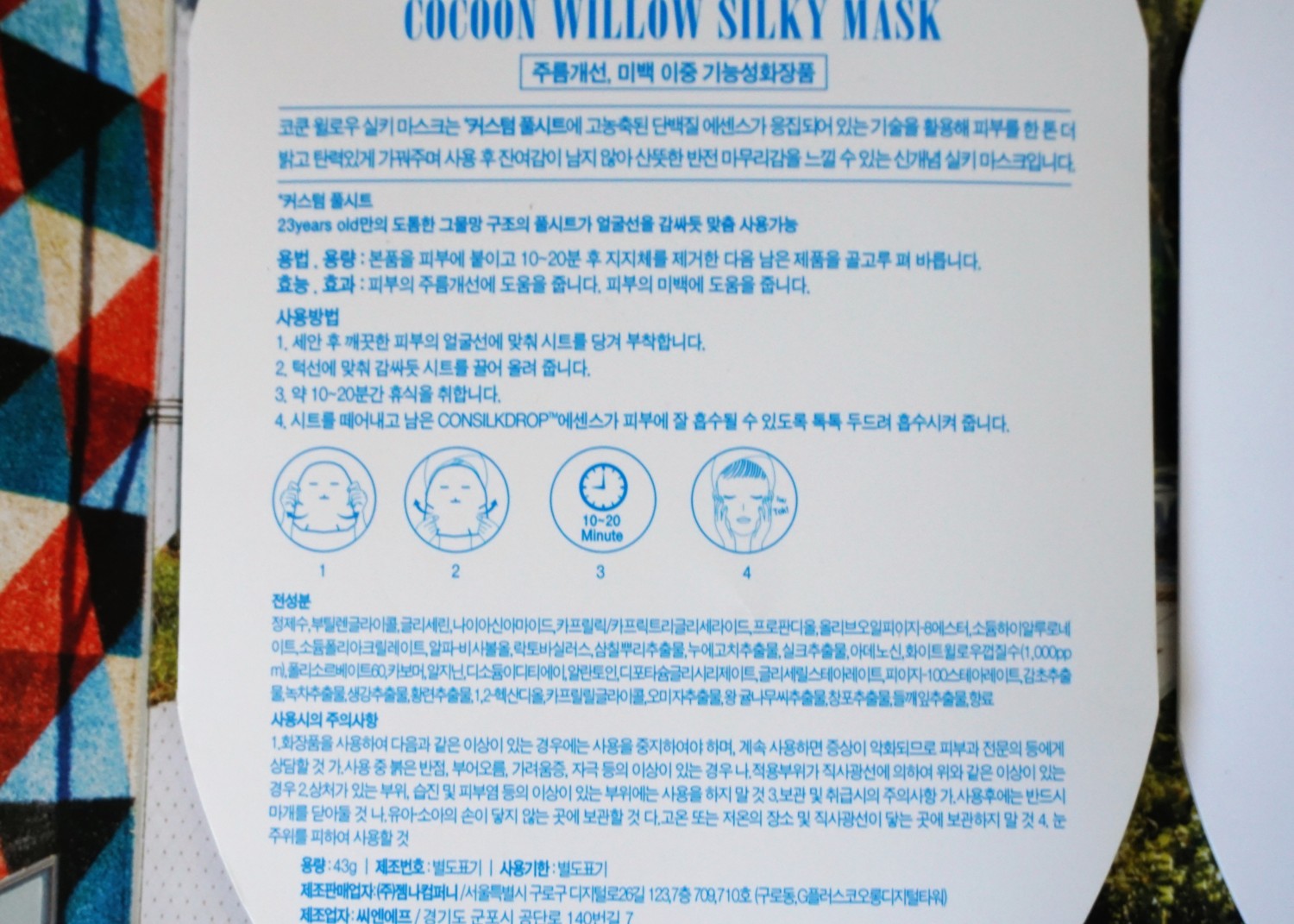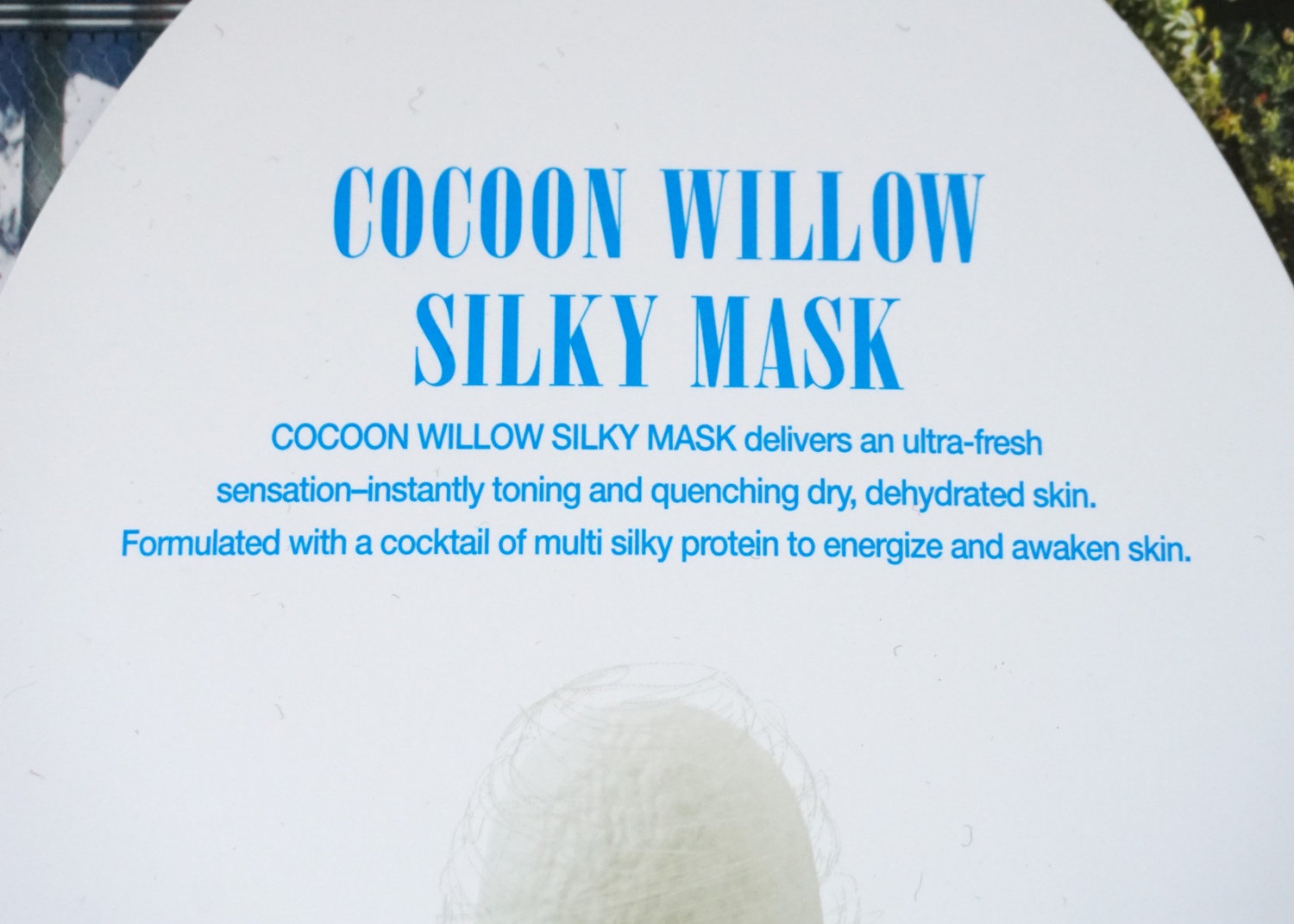 When I first opened the mask (I used the Cocoon Willow Silky Mask first), I was surprised to see how thick it was. I also thought it was one of those creamy/milky masks, which I’m not a fan of because they almost always leave me with a zit. I was happy to see after I unfolded it, that it was not. It was drenched in serum, though. I like the thickness of these masks, but that unfortunately did not contribute to more moisture. I also like that they extend down past your chin so you have extra material to go under your chin.