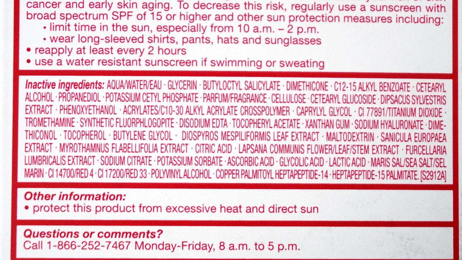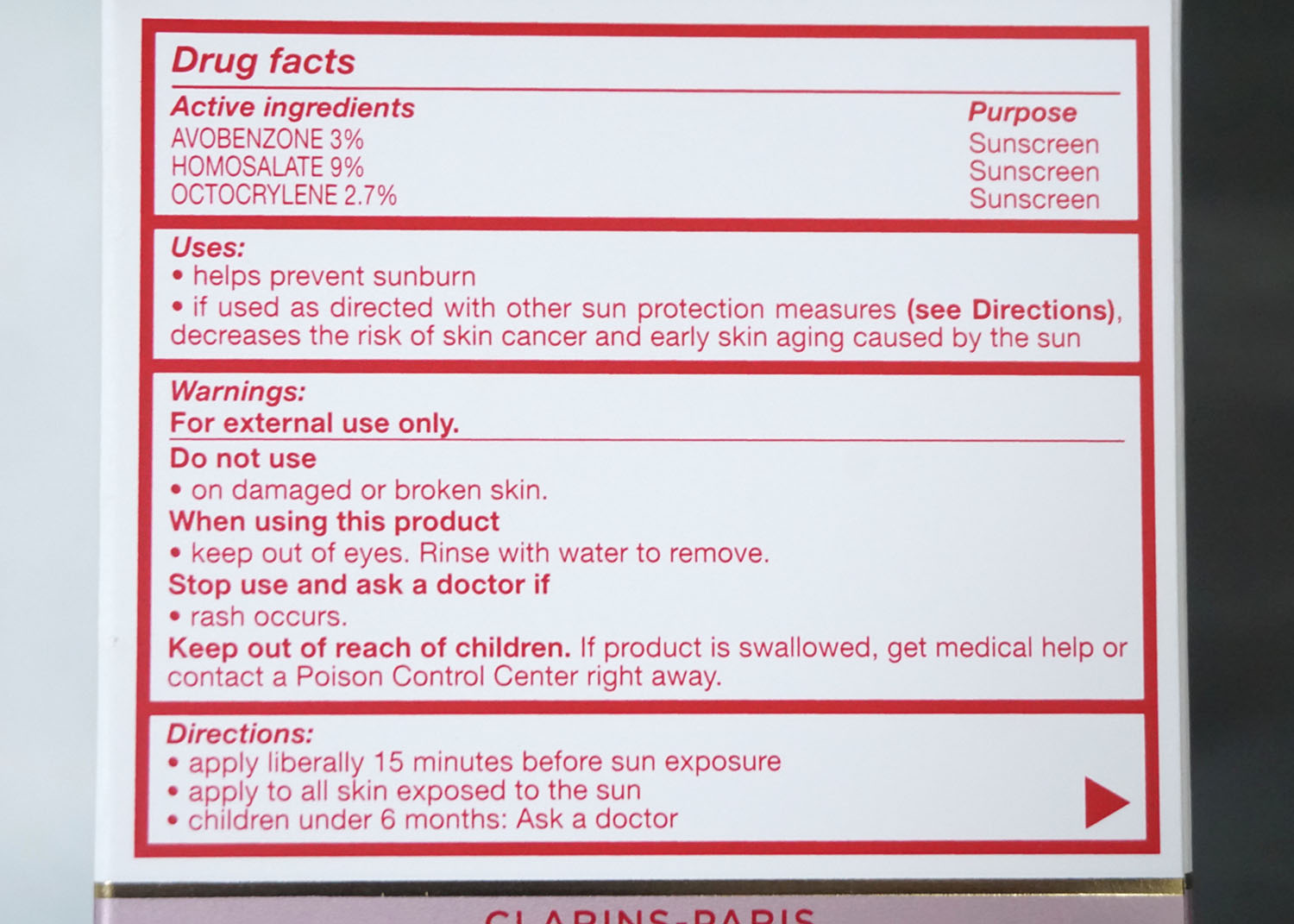 Avobenzone 3%, Homosalate 9%, and Octocrylene 2.7%: Sunscreen.