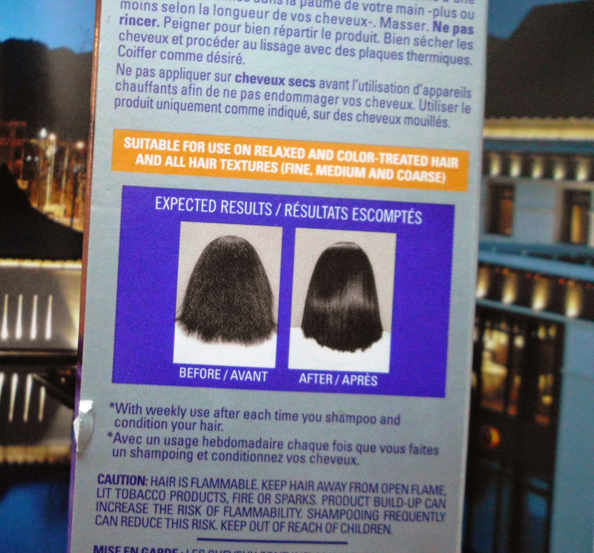 So this product claims to prevent curls, kinks, and waves up to 6 weeks while you are in between relaxers. It alleges humidity blocking technology, frizz control and locking in shine… officially
