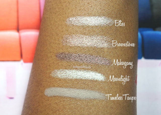 I also purchased her limited edition set for $39.00 earlier on, which was a great freakin’ deal for five full-sized shadow sticks. The set came with: Bliss, Brownstone, Mahogany, Moonlight, and Timeless Taupe. Timeless Taupe is the only one that isn’t part of the permanent collection.