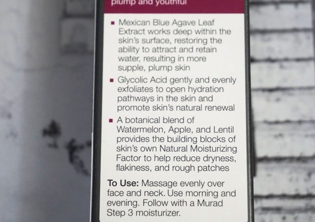 Other Ingredients: Water (Aqua), Cyclopentasiloxane, Cyclotetrasiloxane, Glycerin, Propanediol, Dimethicone Crosspolymer, Glycolic Acid, PEG/PPG-18/18 Dimethicone, Urea, Yeast Amino Acids, Trehalose, Inositol, Taurine, Betaine, Citrullus Lanatus (Watermelon) Fruit Extract, Pyrus Malus (Apple) Fruit Extract, Lens Esculenta (Lentil) Fruit Extract, Sodium PCA, Sodium Lactate, Yeast Extract, Zinc Gluconate, Tocopheryl Acetate, Butylene Glycol, Ascorbic Acid, Chitosan, Propyl Gallate, Disodium EDTA, Cetyl Alcohol, Hydroxyethylcellulose, Sodium Hydroxide, Ethylhexylglycerin, Phenoxyethanol, Caprylyl Glycol, Chlorphenesin, Benzyl Benzoate, Hexyl Cinnamal, Hydroxyisohexyl 3-Cyclohexene Carboxaldehyde, Limonene, Linalool, Fragrance (Parfum) (from Murad.com)