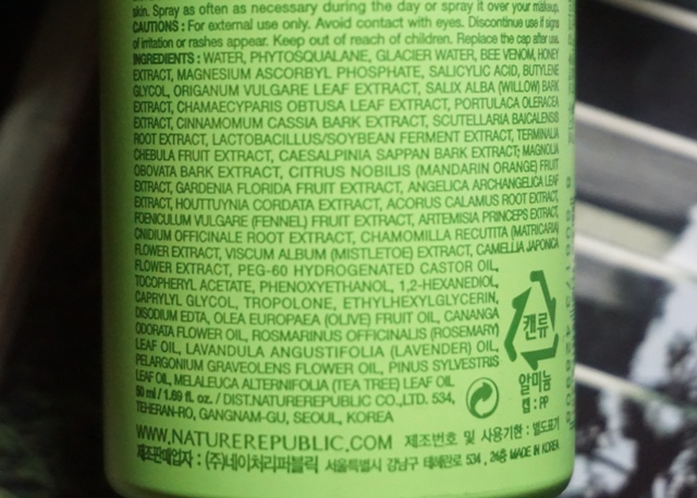 I purchased the mist on a weekend trip to NYC at the Nature Republic in Union Square. I got the 50ml version in case I ended up not liking it (there’s also a 100ml version). What attracted me to the mist was the salicylic acid and fermented ingredients. According to the Nature Republic website, the mist contains lactobacillus, fermented milk/sugar, bee venom, salicylic acid and other exotic sounding plant extracts and chemicals. So you can see how I felt great about purchasing this.