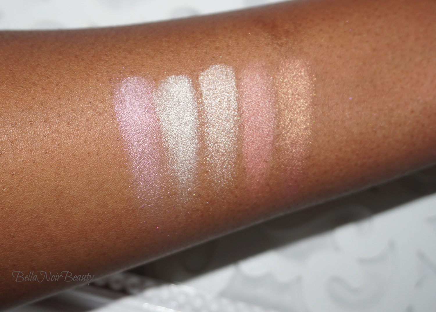 Go with the flow! I use the highlighter brush (4) from the BH Cosmetics x It’s My Raye Raye collection and lightly swipe the powders on my cheekbones and blend out. I also tried the powders on my eyelids, which didn’t hold up by end of day, but it sure was pretty! After about 10 hours, I did notice that the highlighter on my cheeks had faded some. I love mixing the shades together and using them on their own, equally. Turn It On – Pearl can come off a bit stark on me but blending and toning down with a warmer shade solves that.