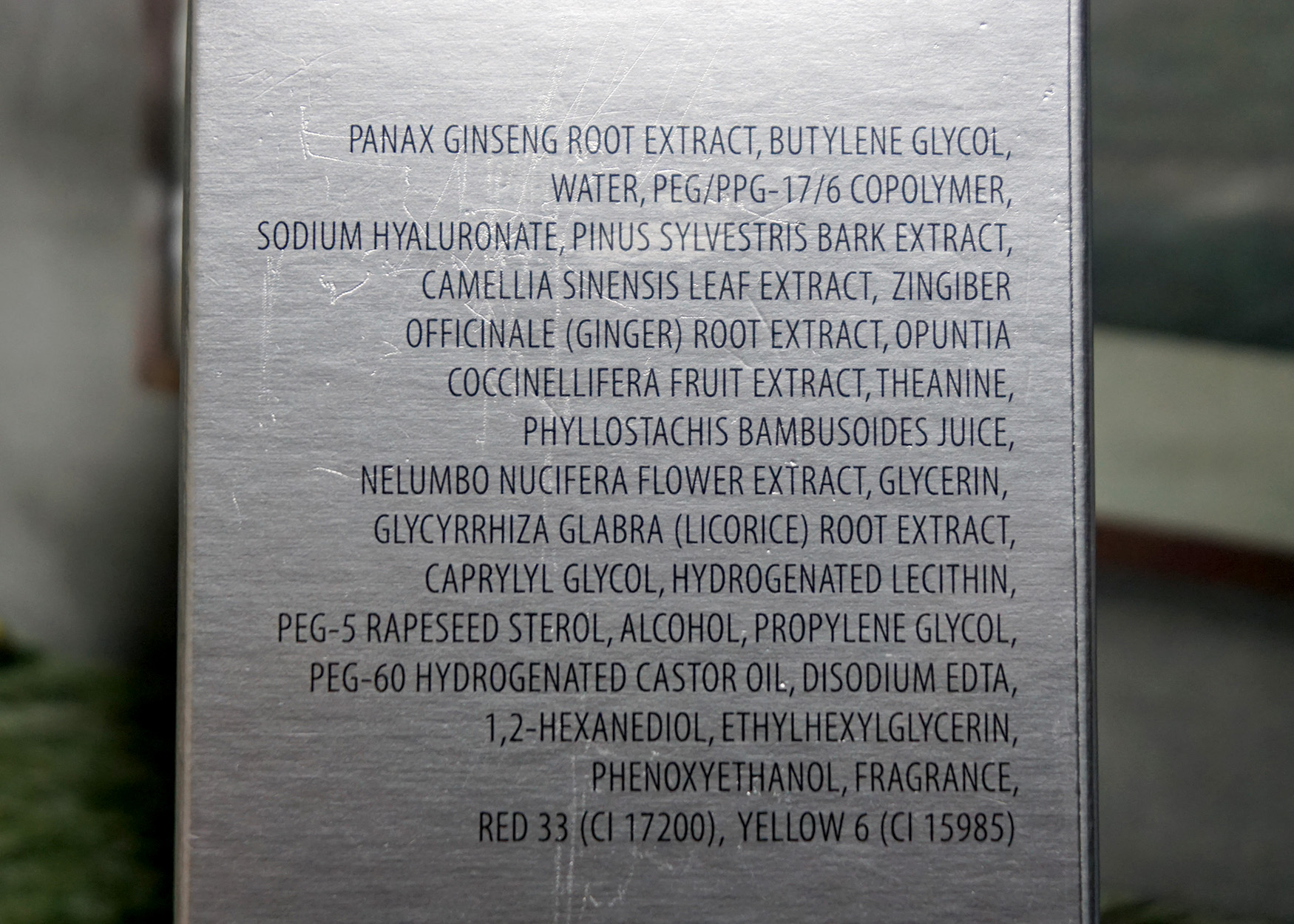 Panax Ginseng Root Extract, Butylene Glycol, Water, Peg/Ppg-17/6 Copolymer, Sodium Hyaluronate, Pinus Sylvestris Bark Extract, Camellia Sinensis Leaf Extract, Zingiber Officinale (Ginger) Root Extract, Opuntia Coccinellifera Fruit Extract, Theanine, Phyllostachis, Bambusoides Juice, Nelumbo Nucifera Flower Extract, Glycerin, Glycyrrhiza Glabra (Licorice) Root Extract, Caprylyl Glycol, Hydrogenated Lecithin, Peg-5 Rapeseed Sterol, Alcohol, Propylene Glycol, Peg-60 Hydrogenated Castor Oil, Disodium Edta, 1,2-Hexanediol, Ethylhexylglycerin,Phenoxyethanol, Fragrance, Red 33 (Ci 17200), Yellow 6 (Ci 15985).
