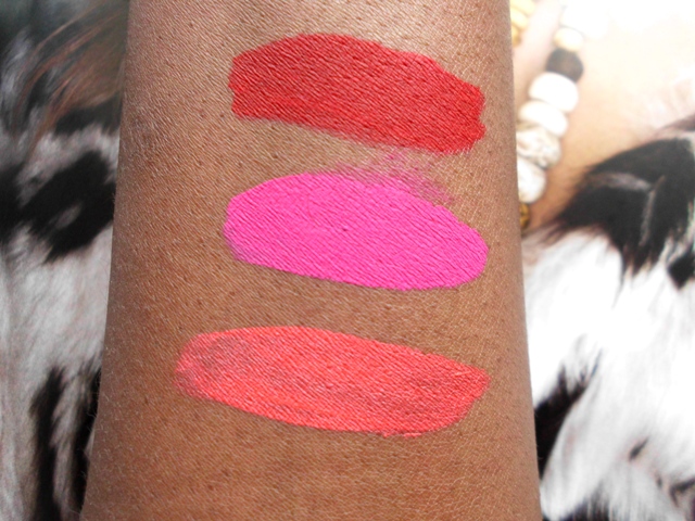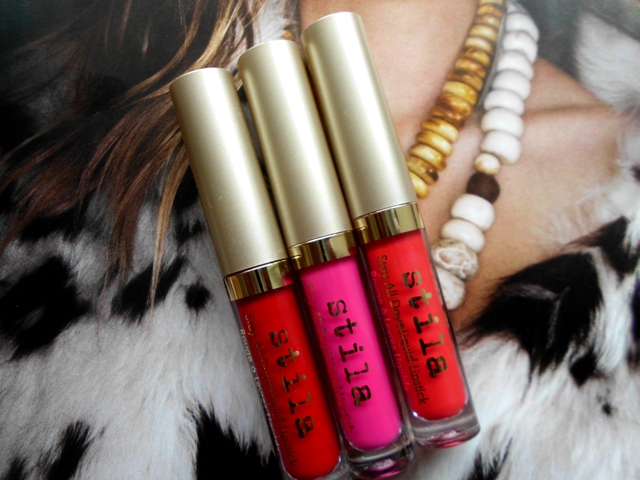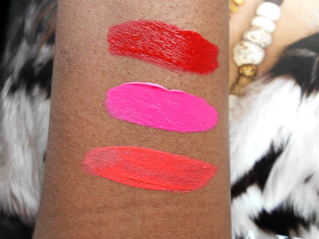 These babies are part of the Birchbox x Stila collaboration, in a kit called Stila Look at Me ($20.00). I have wanted to try out the Stila Stay All Day Liquid Lipsticks forever, but the Summer colors just looked so bright, I was kind of scared to invest in them. So when I came across this little Birchbox trio, it was like my makeup fairy godmother sent me a sign! The colors in the collection are Venizia (bright red), Bella (bright pink), and Beso (true red). Venizia and Bella are from the summer collection and Beso looks like it’s permanent. Have a look at some photos and swatches: