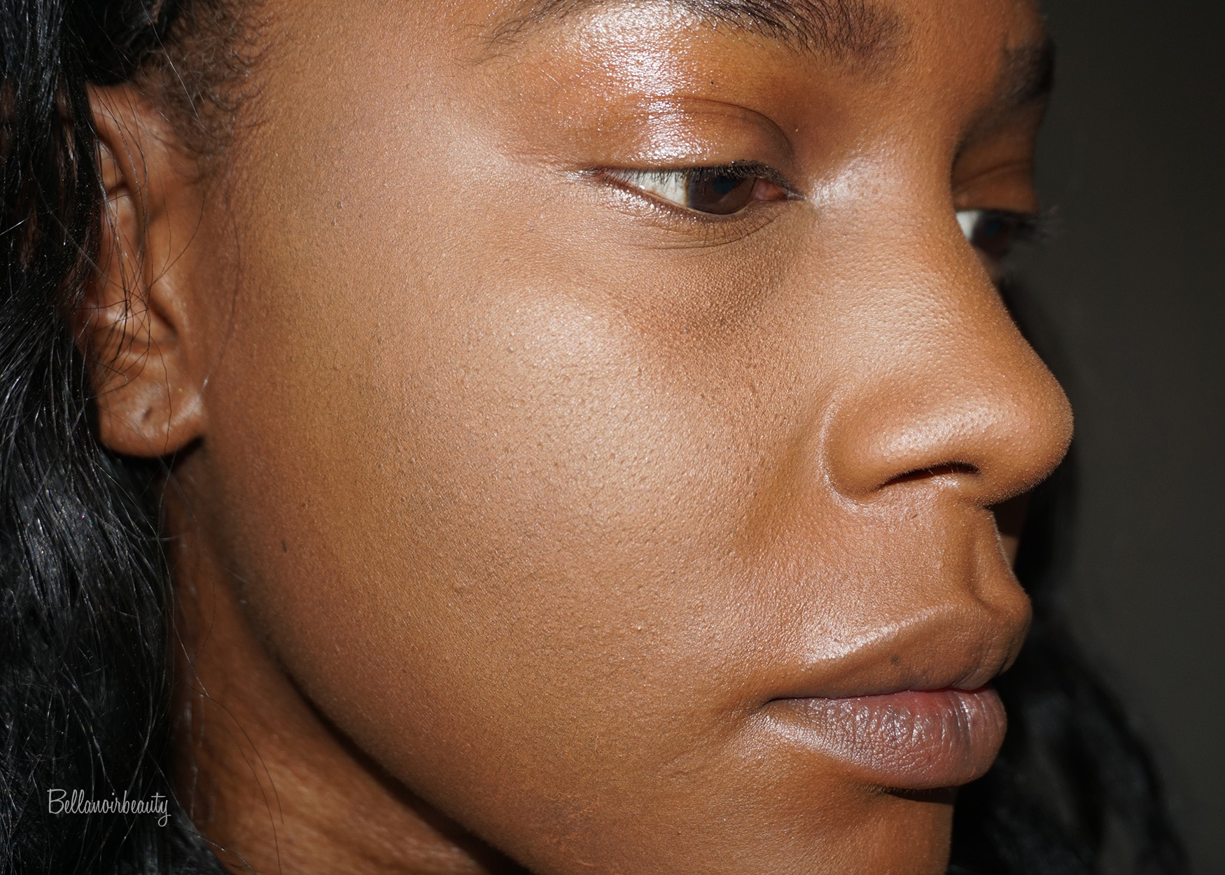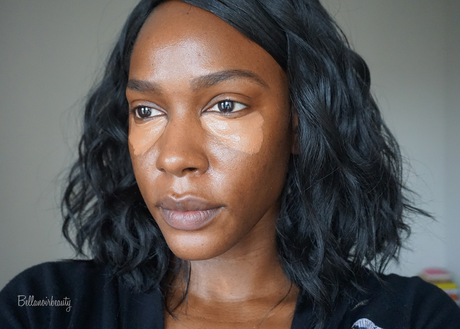 | Dark setting powder applied on left side of face |